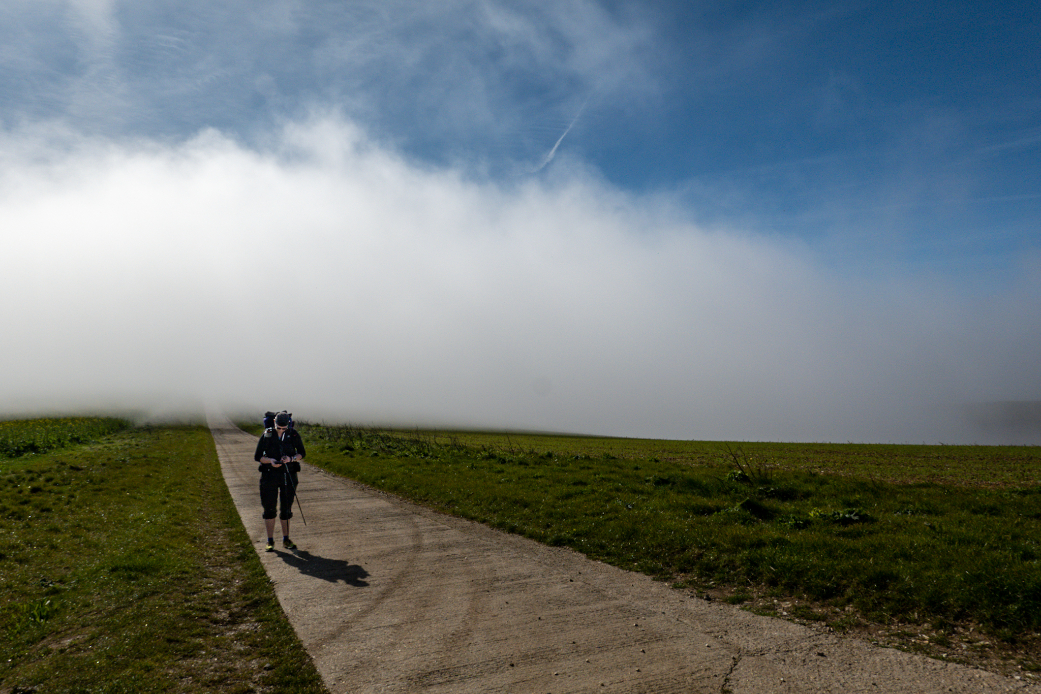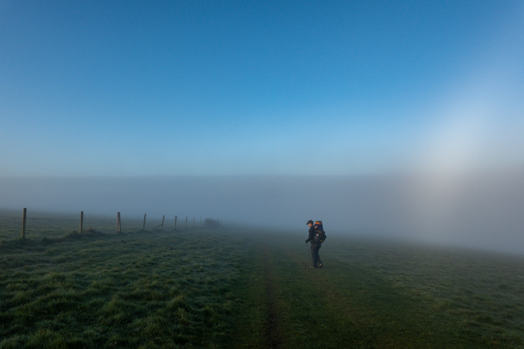 Once we were finally packed away and got onto the trail I obviously had to take about 400 more photos of it so it took a little longer than usual to make our way along the ridge as the sun rose behind us. We were heading into Southease which was obviously under all that cloud, it was so weird walking towards the wall of moisture. Like, we could see it, and we thought we should have been in it by now but we weren’t, or were we? Was it outrunning us? It was several metres before we realised that yes, we were well and truly buried in it and the temperature plummeted. It was eerie. Pretty sure this is how way too many B movies start.