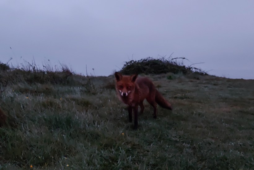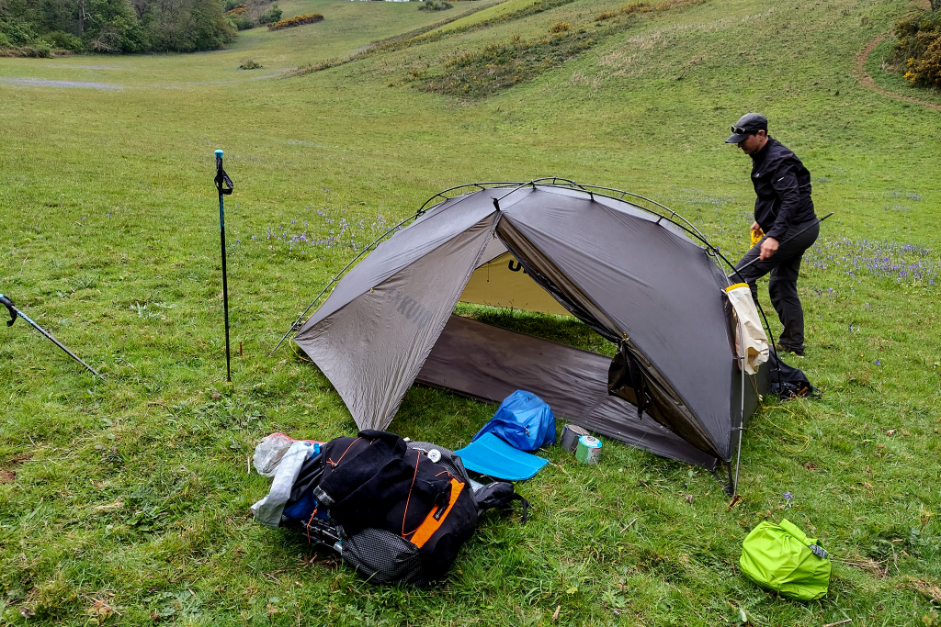 We had to walk up some insidious hills after Shaldon but with great hills come great views. They were really quite awful hills though and you do get to the point you wish they’d just bloody stop so you could experience normal breathing again. Unfortunately great hills don’t come with very many ideal spots to stick a tent for the night. We didn’t want to walk until too late so we said we’d nab the first acceptably slopey spot we could. Perhaps we’d have to readjust our definition of acceptably slopey. Fuck it. We broke all the rules of wild camping by pitching about 15 metres from the trail at 6.30pm, and shovelled some food into our chops.