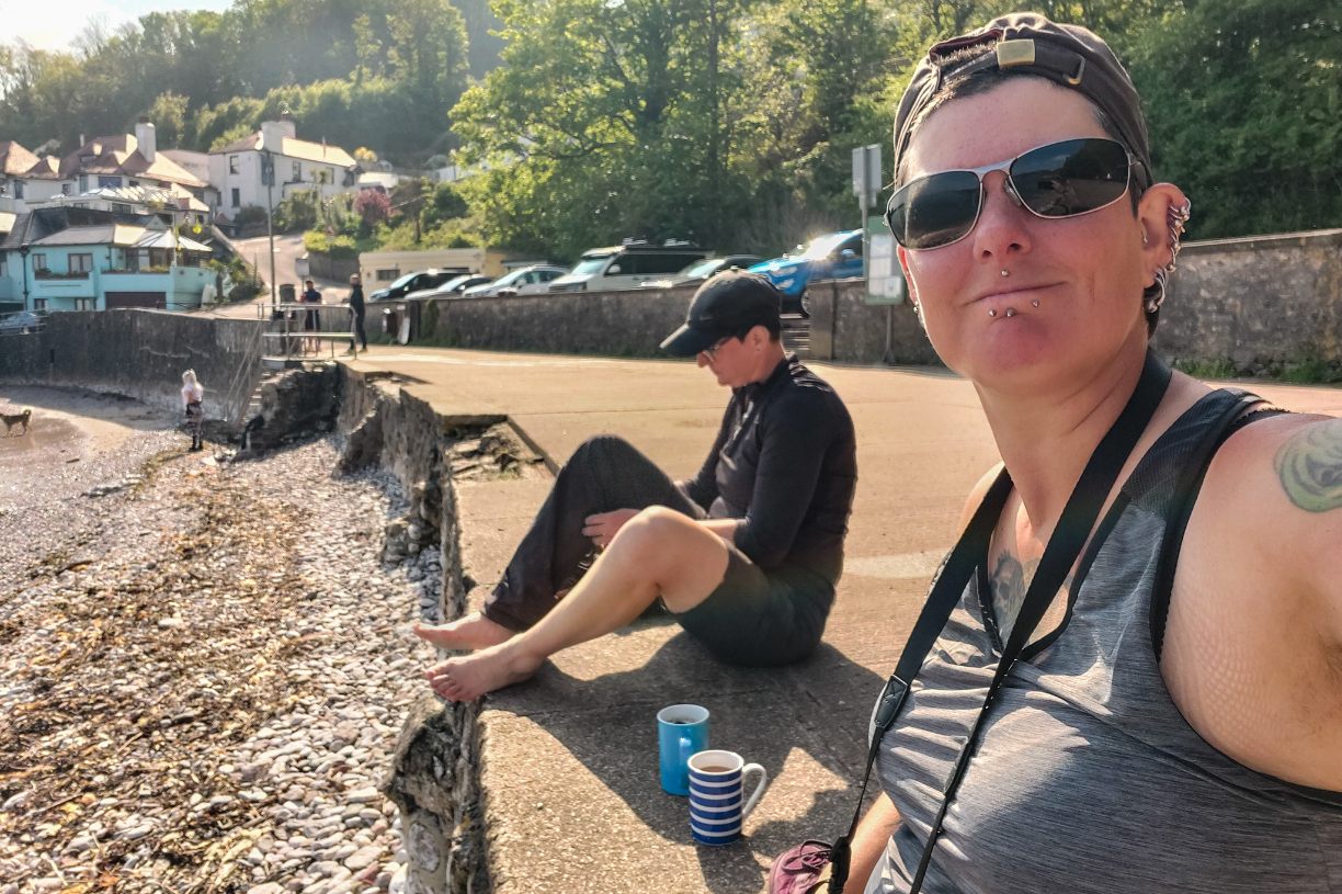 Babbacombe Bay though, that was our saviour. There’s a little café there, nothing more than an ugly concrete building with plastic chairs on the promenade, but teas and coffees were served in proper mugs. Yes. This would do. We sat with our legs dangling over the promenade, sipping our drinks and taking in the eyehole fodder.