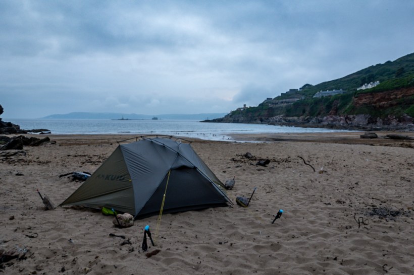 Nowhere presented itself as an ideal camp spot and the city loomed closer. Tittywank shit fuck bollocks. Should have stayed where we were. We got as far as Bovisand and decided to call it a day, we didn’t want to end up in the suburbs huddled behind a pillar box or something. The beach it would be. A sandy beach. What a perfect end to a perfect fucking day.