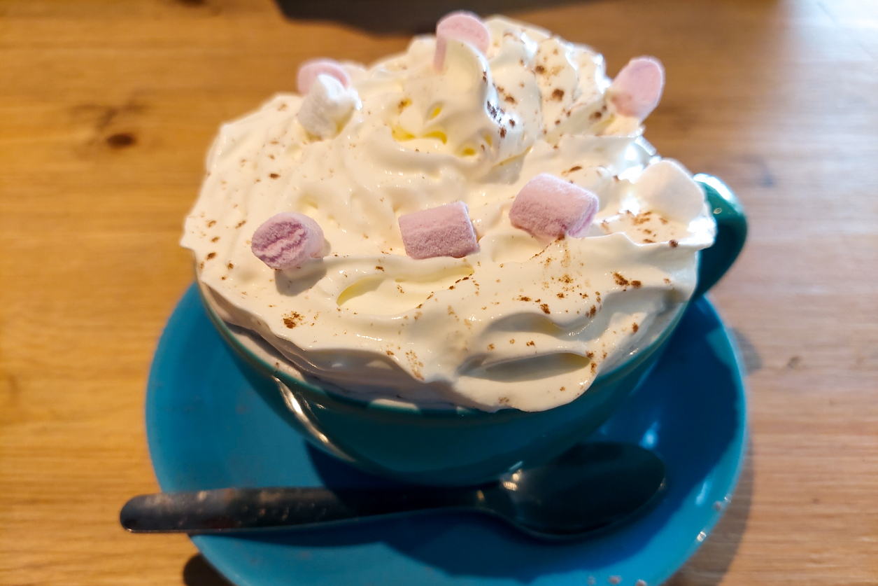 We managed to eke out two drinks each over the space of two hours as we slowly leeched their electric, but to be fair one of mine was a hot chocolate laden with marshmallows and squirty cream. Sugar crash scheduled for 3pm, please. I figured I needed calories and no one told me the calories couldn’t be tooth rot in a cup so there you go.