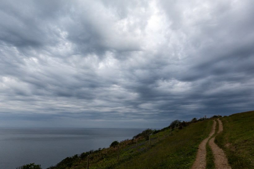 We’d been eyeing up a spot not a huge distance from where we’d accidentally fallen into a boozer so we headed for that. There’s a trigpoint there and from the photos on the trigpointing website there was also a shit tonne of flat ground. We beelined as fast as our little legs would allow us, the sky disappearing under these insane wavey clouds that looked like they could produce either rain or an alien invasion at any given point. At this stage I wasn’t sure what I’d prefer. We could see rain pissing down over the Channel so yeah, wouldn’t have to fend off extra terrestrials with a spork just yet.