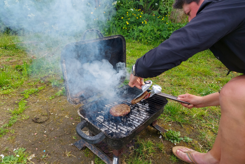 We’d read on the campsite’s website that they had barbecues knocking around for people to borrow, and that they sold charcoal in the shop. We’d become so obsessed with the idea of having a barbie over the last few days that we didn’t stop to consider the practicalities. We acquired the barbecue, purchased the coals and the various dead things and got it lit before realising that we had no barbecue tools at all. Well shit. But nothing would keep us from our feast. Turns out if you cut the top off a Stella can, flatten it and Gorilla Tape a trowel to it, it makes a perfectly adequate and somewhat classy spatula.