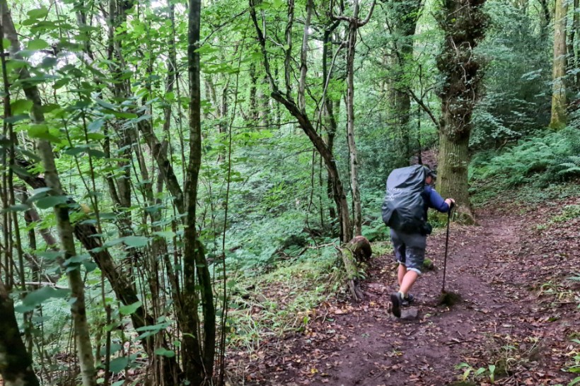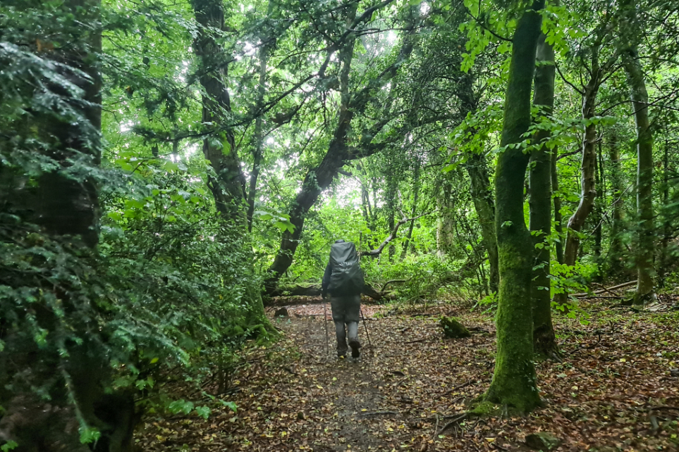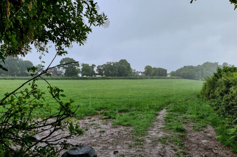 The rain started up again so we just huddled under trees until it eased off enough to get going without waterproofs, then the sun came out again. Sigh. That’s how it was going to be then. We continued our woodland plod and as we emerged into a field the skies opened again a and started dumping quite substantial quantities of wet shit onto our day. We retreated back into the woods but it just got worse and worse until even the woods were no shelter. Fuck it. Full waterproofs back on then.
