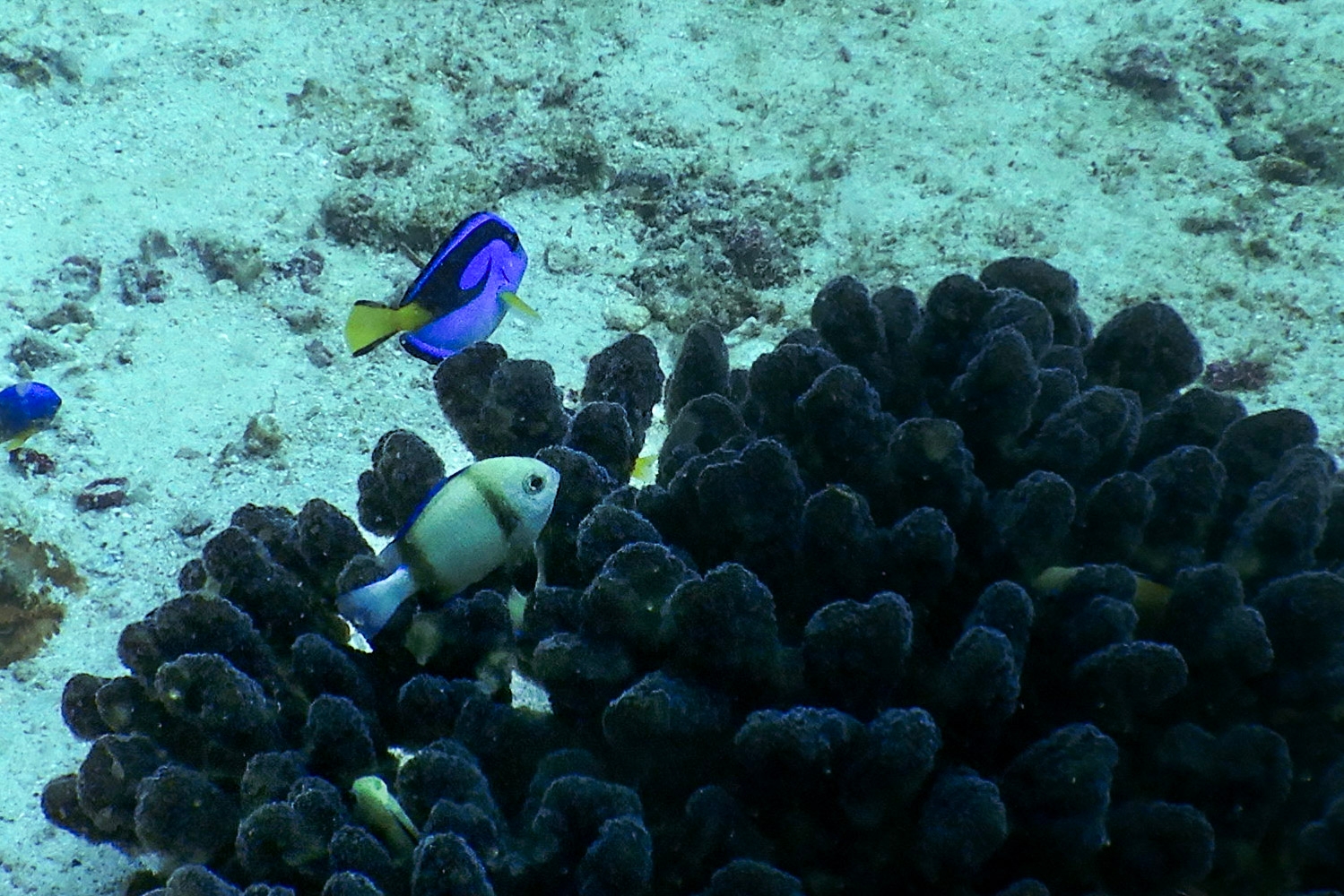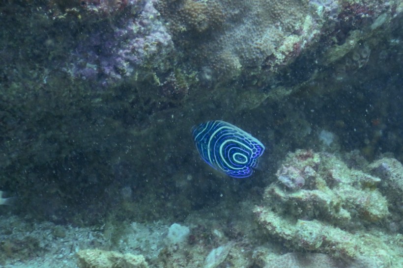 The first site we went to was Oscar’s Reef. I’m not going to lie, the viz was fucking awful, the water full of plankton, but there was loads of lovely, healthy coral and plenty of fish to point your face at. There were these little bright blue fish that I couldn’t get enough of, little bolts of electric darting between the coral. We saw a big stingray that was minding its own business, doing its best to be covert and sand coloured until six bipeds showed up to silently stare at it.