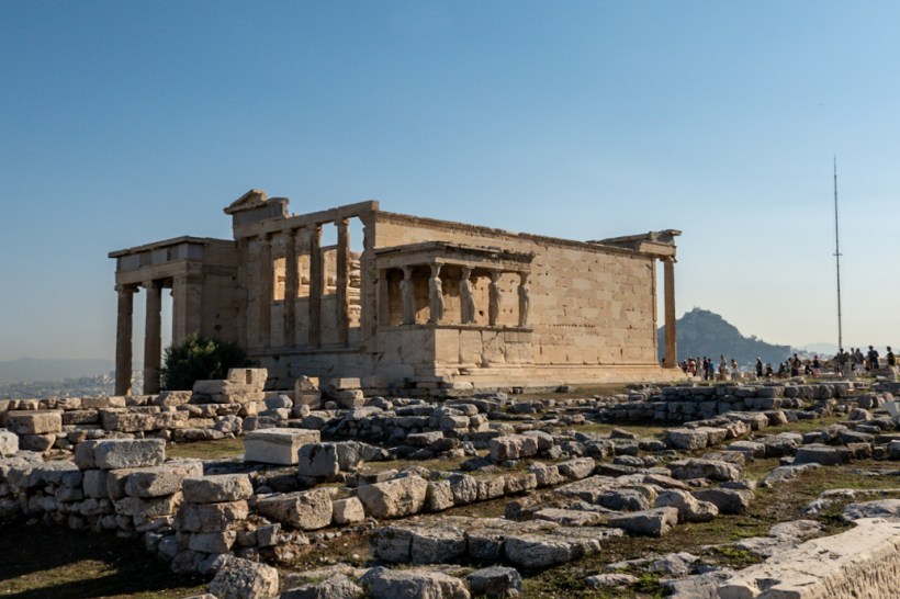 There’s another small temple albeit bigger than the Nike temple called the Erechtheion and this housed a wooden statue which was given new robes every four years during the Panathenaia festival. That’s the bad boy that started at the gate in Kerameikos, made its way diagonally through the Ancient Agora although back then, obviously, it was just the agora, then up the hill, up an absolute shit tonne of steps to this very temple right here. Shit me, religion sounds exhausting.