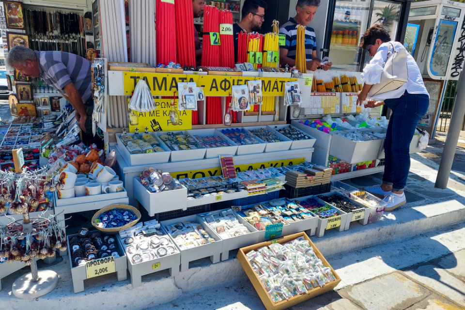 Then we thought we might as well go and check out the church which is hugely important as churches go. The Holy Church of the Virgin Mary Evangelistria was built around some manner of icon after the Virgin Mary appeared to a nun and told her where it was. The church sits atop a hill and as you walk up the main road you’ll notice a carpet fixed to the floor lined with traffic cones that have been bolted down. “Oh how nice,” you think, “they’ve put carpet down so we don’t slip on the marble.”