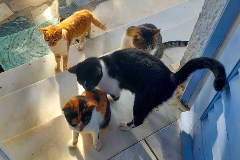 We spent the rest of the afternoon just hanging out outside our room with the cats, drinking Metaxa and yowling along to 80s music, until the wind got so bad we had to retrieve our laundry from various cacti within a three metres radius. The wind has brought the temperature down to something way more manageable than the face melting the-air-is-lava levels it’s been at but we have to catch a ferry to Paros tomorrow and I fear for my stomach contents.