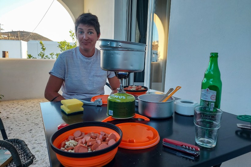 We could probably have coped on account of the price, we could have made it work but it was so fucking dusty. The wind is no one’s fault but the area you pitch your tent was just this fine dirt which coated everything. It was fine enough to get through the mesh of the tent inner, everything was covered in the shit and when I woke up several times wiping the grit out of my eyes and mouth that was it. No way could we stay here. We booked the cheapest room in Naoussa we could find the following morning and bailed.