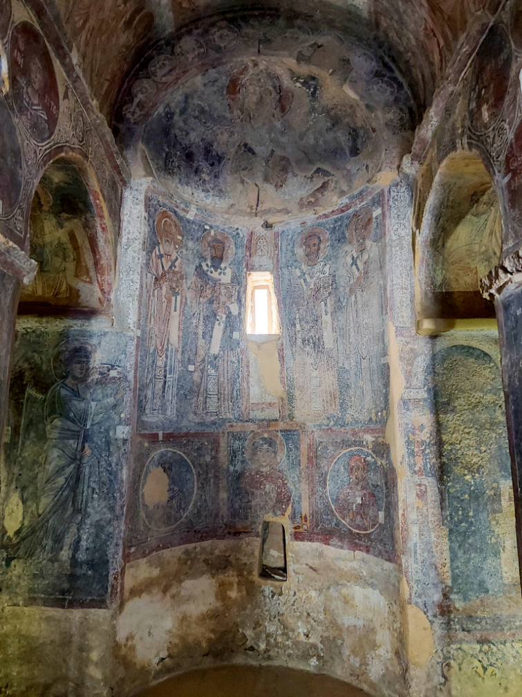 Agios Georgios Diasoritis is an 11th century church and it’s covered inside with quite well preserved religious frescos from the 11th to the 13th century. So really fucking old then. I don’t have a clue what’s going on with them, you could tell me they depicted Monty Python chasing Hitler down Oxford Street with a cucumber trying to get him to sign up for their MLM and I’d be all like, oh cool, cucumber, yeah nice. In actuality it’s more to do with Saint George who the church is dedicated to which makes more sense.
