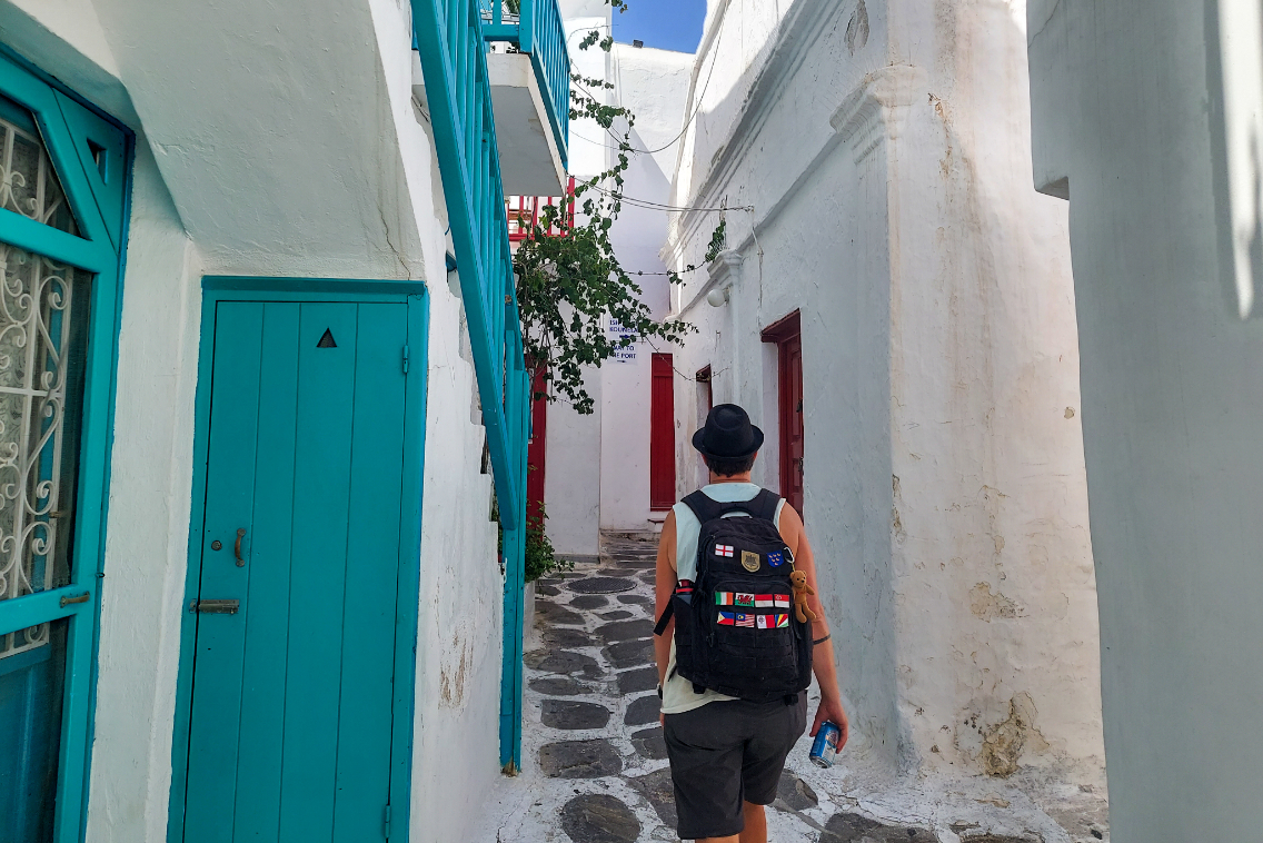 Y’know I could quite happily have done without Mykonos but it was part of the day so here we were, sizzling in the hot, narrow streets, hemmed in by wall to wall humans. I usually love a good, aimless wander through these alleyways but Mykonos somehow manages to make it really fucking stressful.