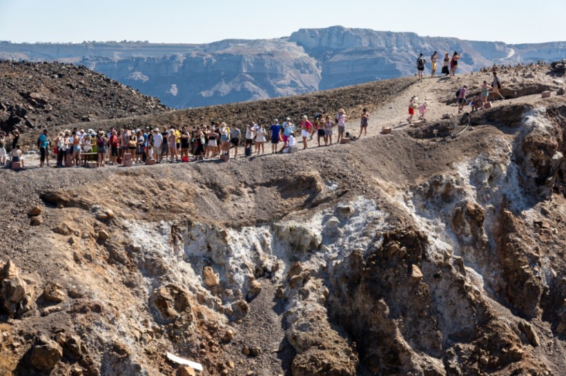 Anyway. This tour. We were loaded onto the boat by a lovely chap called Dada who spoke, like, six languages according to the flags on his chest. I have massive respect for anyone who speaks more than one language to be fair, six languages is just insane. We were taken to Nea Kameni which is the active volcano, a very, very young island only 500 years old.