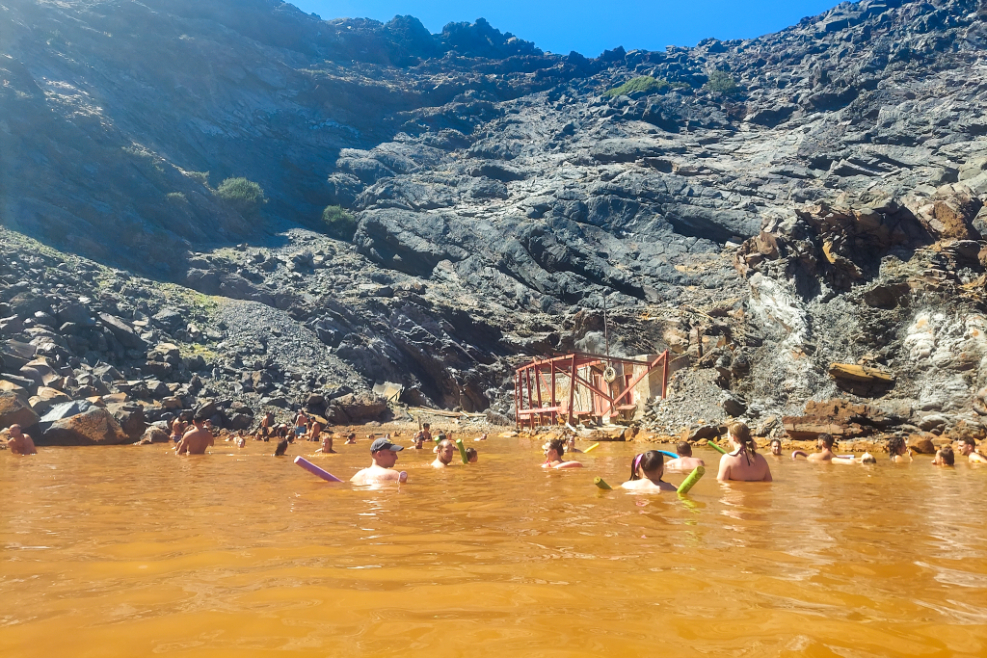 We made our way back to the boat where we were taken to a smaller island right next to Nea Kameni where there was a hot spring. The boat had to moor 50 metres away so we jumped in and swam into the bay where the water, rich in iron and minerals, turned redder and warmer the further into the cove we got. The change was gradual, it was brilliant, every hot spring I’ve ever been to was a definite pool in its own right, not a continuation of the actual sea. It wasn’t as hot as we were expecting either but the air was lava so I guess we didn’t really want it to be stupidly hot anyway.