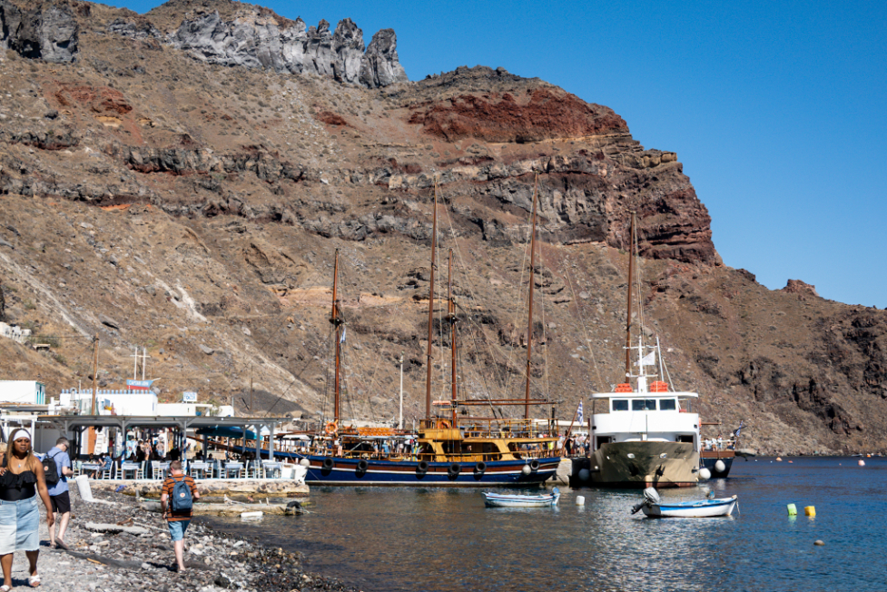 So we duly booked ourselves onto a volcano tour and off we fucked, down the 588 steps, switchbacking to the Old Port of Fira. We got down there super early to make sure we had time for breakfast too. Given the cost of things in the supermarket here, and the hassle of making our own food when all we have is our little stove, it’s actually just worth having something filling for breakfast like eggs, snacks throughout the day, then a gyro or two for dinner. Actually to be fair I fully intend to just live off gyros for the rest of my life.