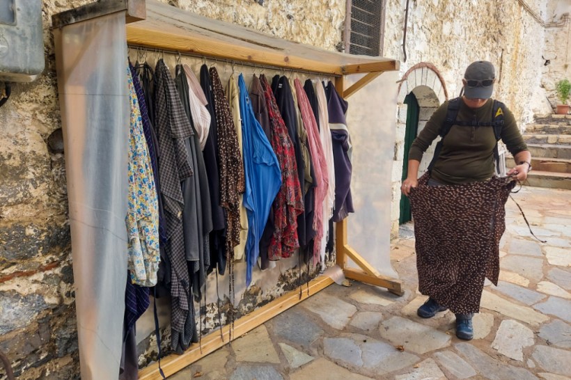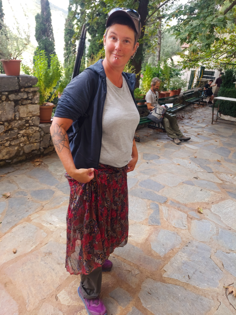 So you need to dress modestly and that includes the blokes, so no shorts. But they don’t like women in trousers either, we’re meant to wear long skirts but don’t think I even know any women my age that own a bloody skirt. If they did they certainly wouldn’t be wandering around the Greek mountains in it. Fortunately they have a rack of skirts you can throw on over your trousers, and there are trousers for men that showed up in shorts.