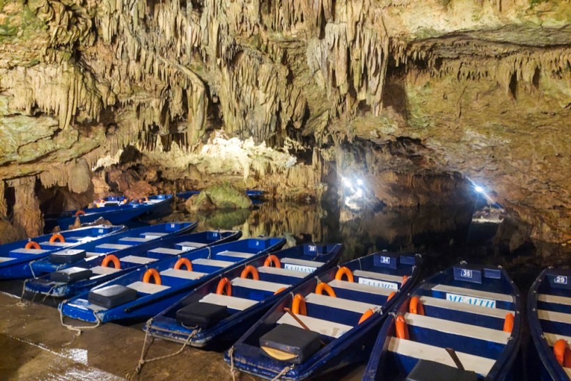Diros Caves though. You buy your tickets and you can either walk or drive down to the entrance from there. Obviously we drove. We’re paying €35 a day for this fucker, it’s going to earn its keep. Then you’re led inside and ushered onto a tiny boat which lists “tilting precariously” as one of its hobbies, then a man with a stick guides the tiny boat through a tiny hole, gliding silently over the still water, stalactites reflecting on the surface.