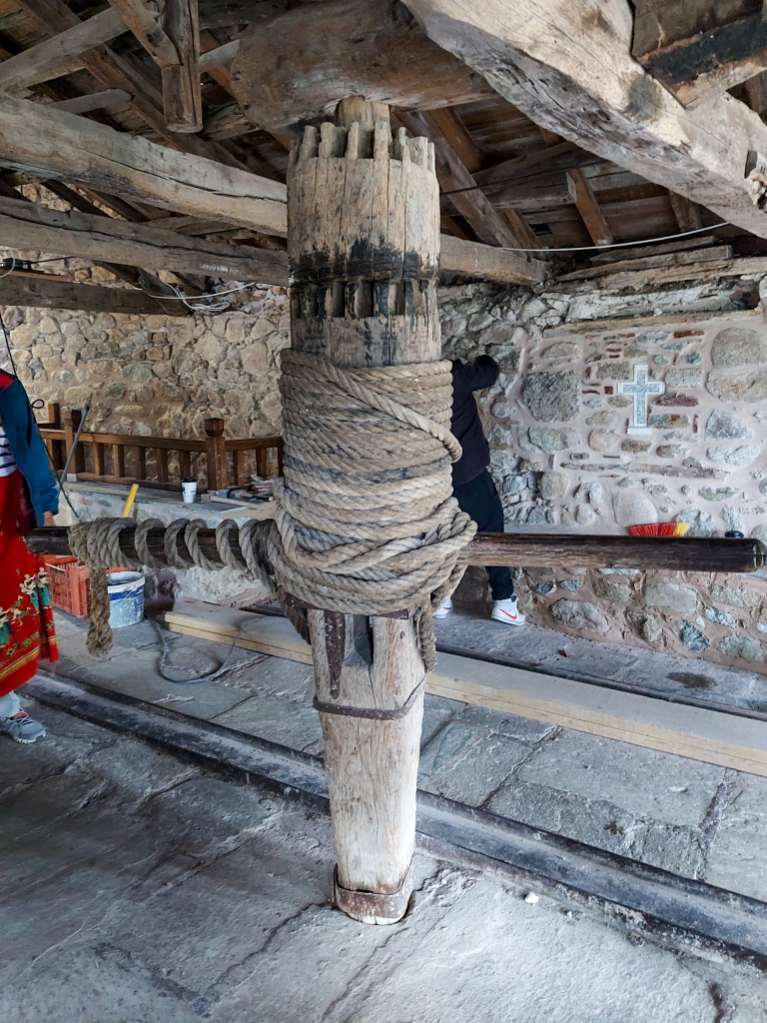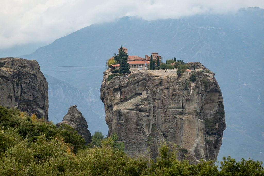 They’re refurbishing a tower that houses a net lift which was used to hoist supplies up to the monastery. I learned in the museum that this is called a vrizoni. You used to have to get up with quite precarious looking ladders, both rope and wooden, so you couldn’t really just nip out for a Mars Bar. These days there are stone steps, and they have a fancy looking cable car to get supplies from the road to the rock.