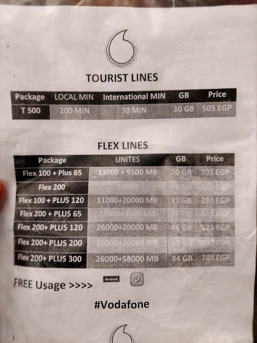 - They have different tariffs but we just went for the Tourist Line as 30 international minutes might come in handy, and 30GB is a massive amount of data. It cost LE505 each. I’m assuming that’s for 30 days? They take cash or card.