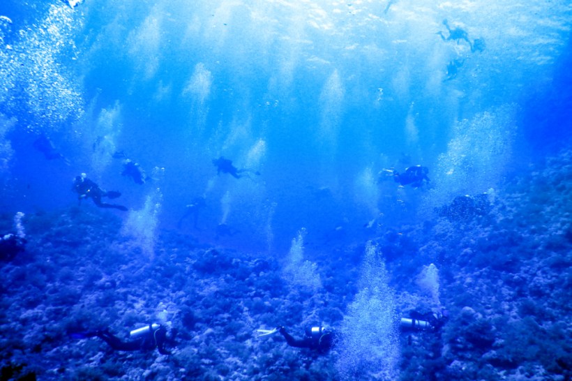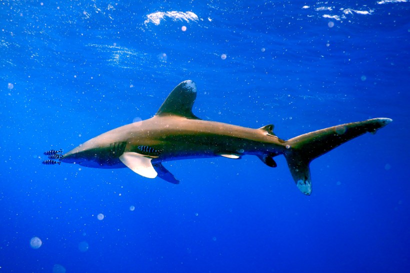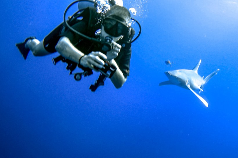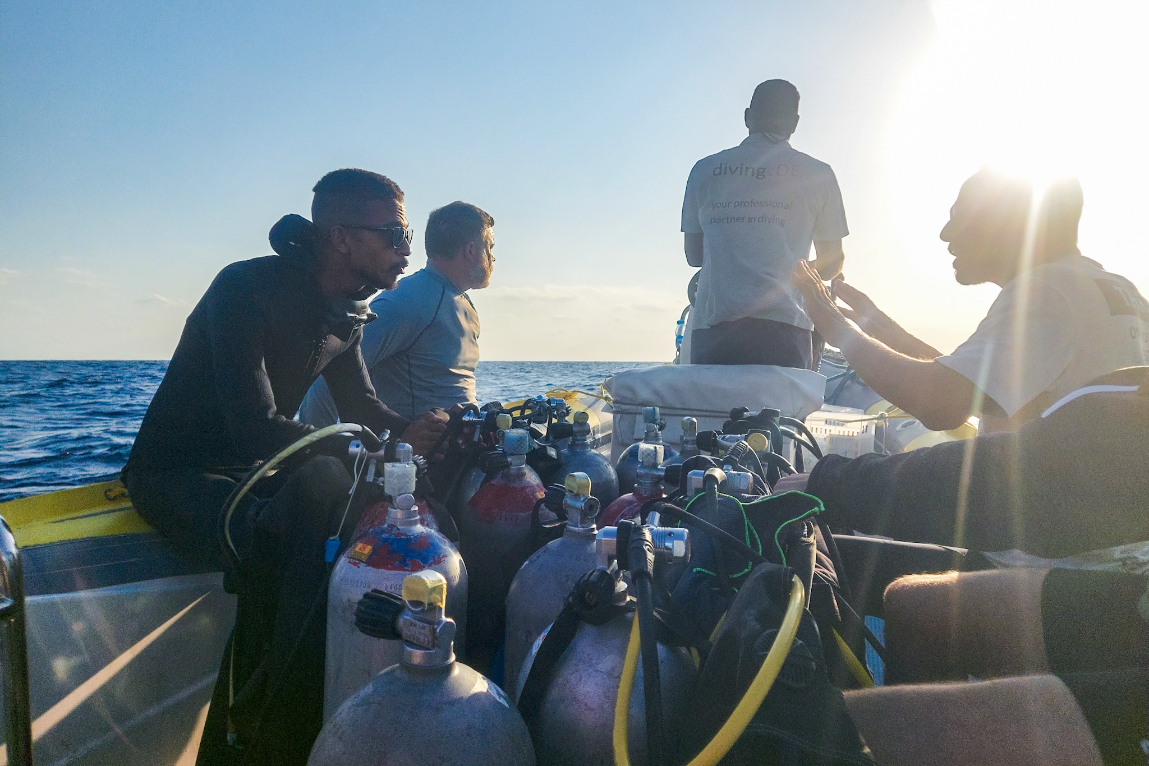 It’s a very busy dive site. We were in a zodiac, just a small group of five tourists plus two guides, but there were other zodiacs plus about five large safari boats. You round the corner to the plateau and all you see are bubbles from the plethora of divers circling the reef. At this point we made our way into the blue and ascended to look for the sharks. We were going to stay around five metres. They’re not bothered by the reef, they like the boats though. They’re curious little buggers and they’re attracted to the noise of the engines.