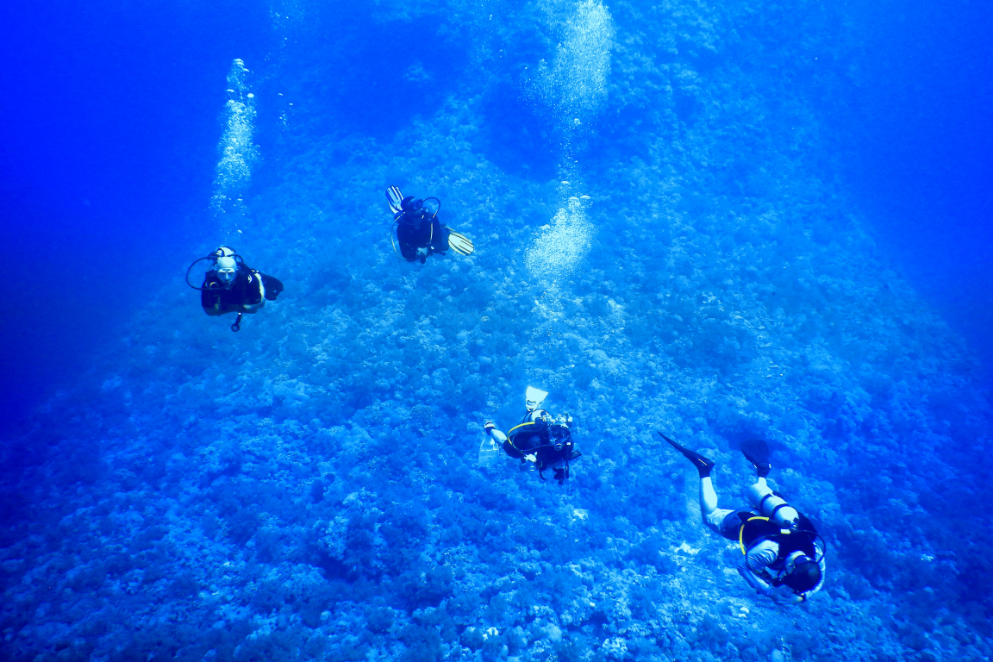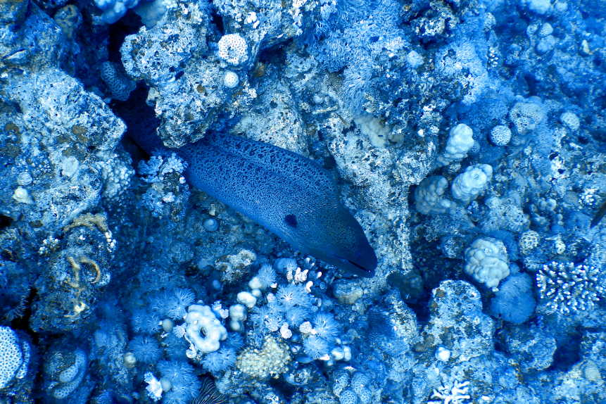 Oh my gosh, what an absolute privilege! There were at least two pods swimming around the boat, it was amazing. We watched them for a short while before finishing our short journey to the dive site. Tarrant and the other snorkellers went off on a zodiac and the divers got kitted up and again we were asked if we wanted to go through a tunnel. Oh for fuck’s sake. Well yes, of course I’m going to because I’m an idiot with FOMO but I told him that I’m not good with small spaces and he might have to drag me out of the hole. Modi was our dive leader today and he promised that I could be right behind him and he’d keep an eye on me.