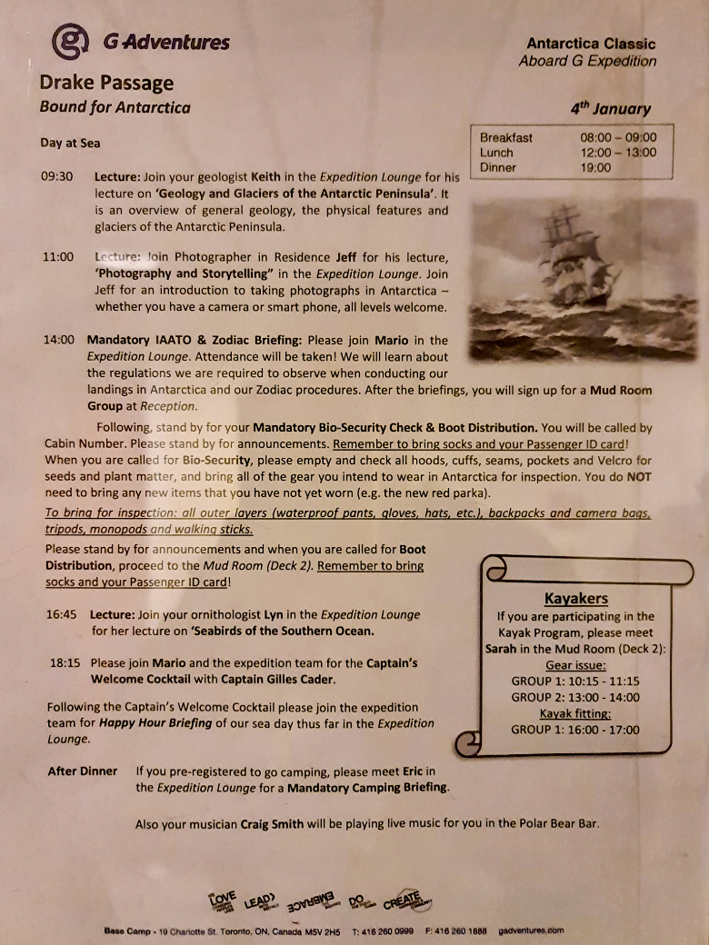 After lunch was the mandatory zodiac briefing and if you didn’t attend you weren’t going to be getting off the ship. Zodiacs are the little rubber boats they use to take you from the G Expedition to the continent. It’s all very exciting. We were told all manner of things such as how to safely get on and off one of these boats, how to put the life jacket on, how… to… stuff and things. It was a very important lecture so obviously I’ve forgotten the vast majority of it and will likely favour a “head first whilst flailing” technique for entering and exiting the zodiacs.