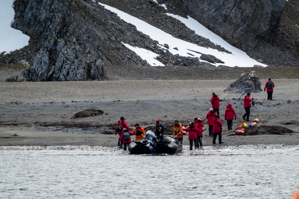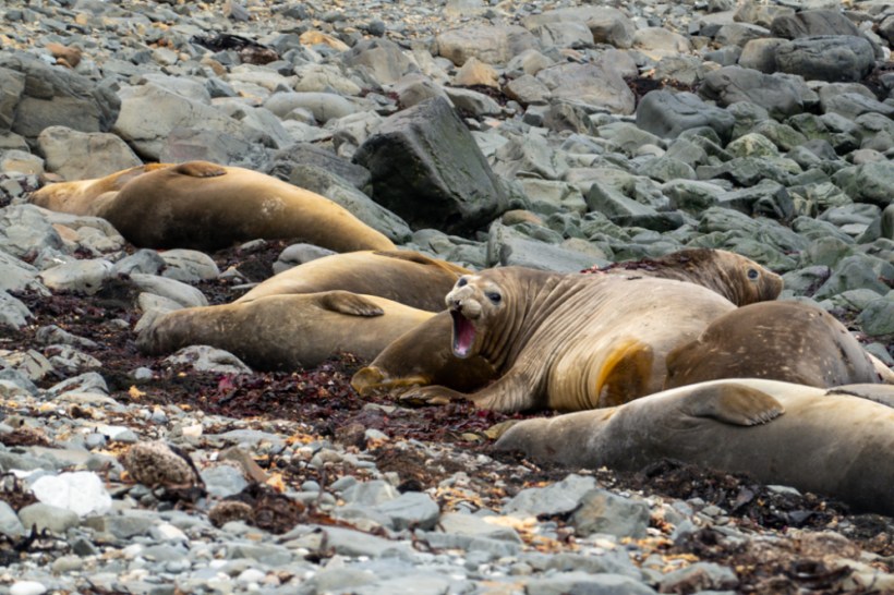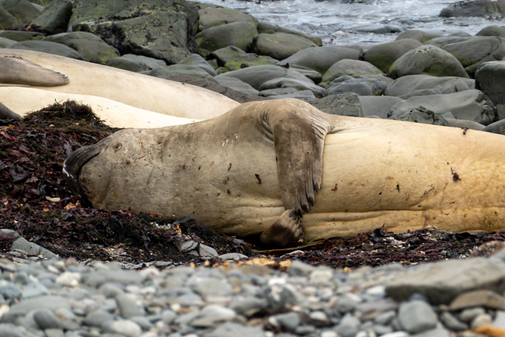 We got kitted up into all our layers and headed to the mud room where our rather fetching boots were waiting for us. We wrestled those on and shuffled to the gangway to the waiting zodiac, were helped onto it by three men, even I managed not to faceplant it then off we fucked. Even as we approached the beach we could see masses of elephant seals just hanging out on the beach. Wait, wasn’t this dangerous? At Peninsula Valdes we were told in no uncertain terms that we weren’t to go to the beach and I figured that was because we’d probably die.