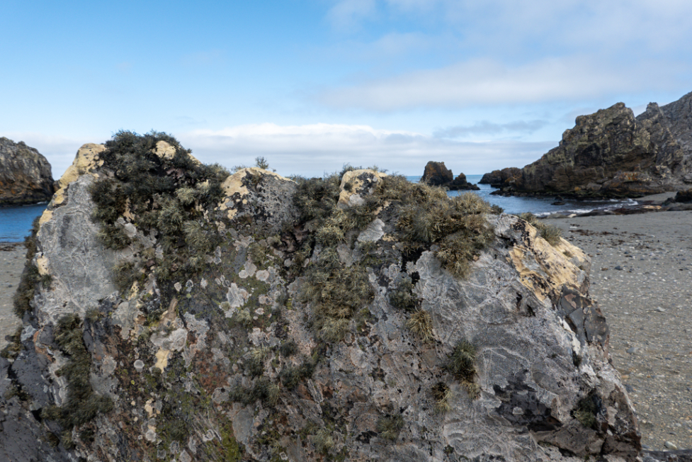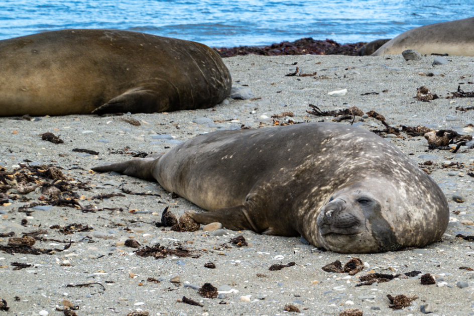 Turns out that five metres is your viewing distance for elephant seals, unless they’re jousting then you give them twenty five metres. I don’t think these seals had jousting in them to be fair and we were allowed to get right up to that five metre limit which they’d marked with flags. It was amazing. Every now and then a seal would lift its head up, lazily regard the red coats gathered on the beach, maybe treat us to a yawn, then it’d flop back down. We wandered up the beach and bothered a couple of gentoo penguins. One of them was lying down, the other was preening itself.