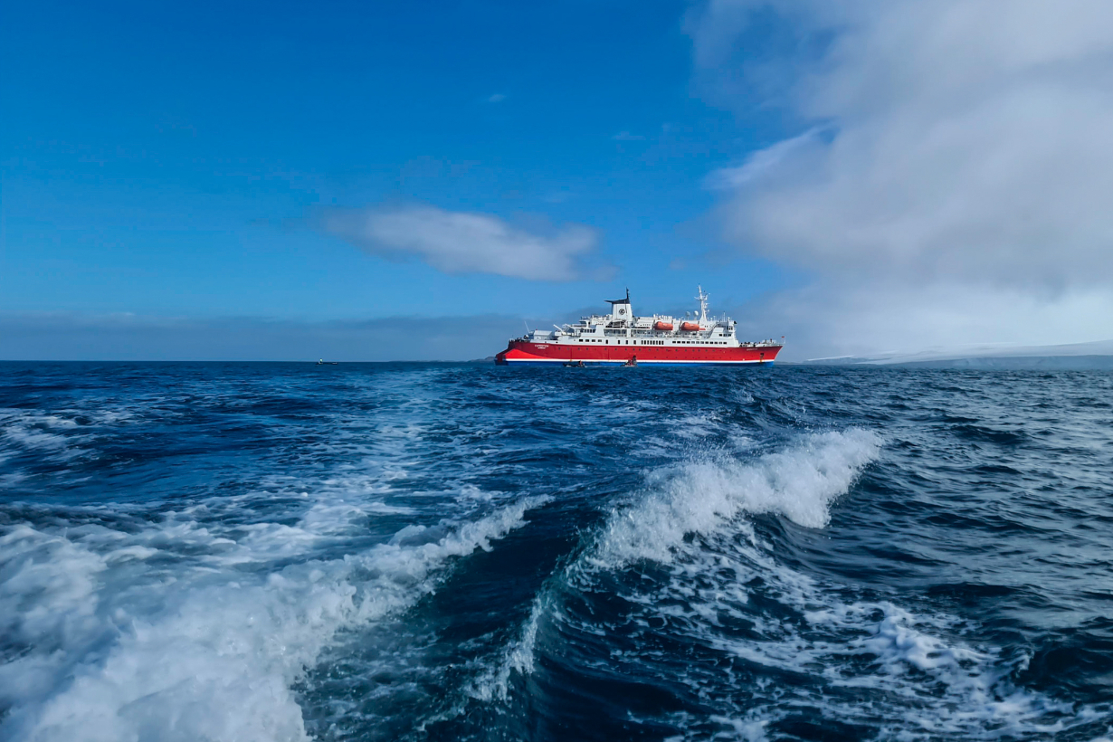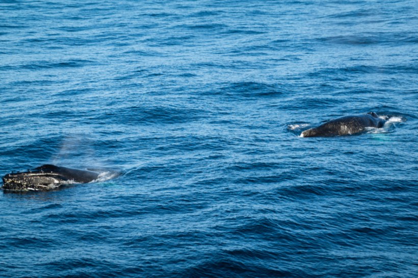As we were shovelling our starters into our chops a whoop went up from the people sat by the port side windows. Humpback whales! But, like, really fucking close! The captain steered the ship closer and just stopped and we all pressed ourselves against the windows. They were blasting air then surfacing, flashing us a bit of dorsal fin and tail. Phwoar! One of them breached! Fuck it, we went outside. We don’t go anywhere without our parkas now in case we have to rapidly get on deck to put wildlife into our eyeholes, we threw them on and headed to the front of the ship.