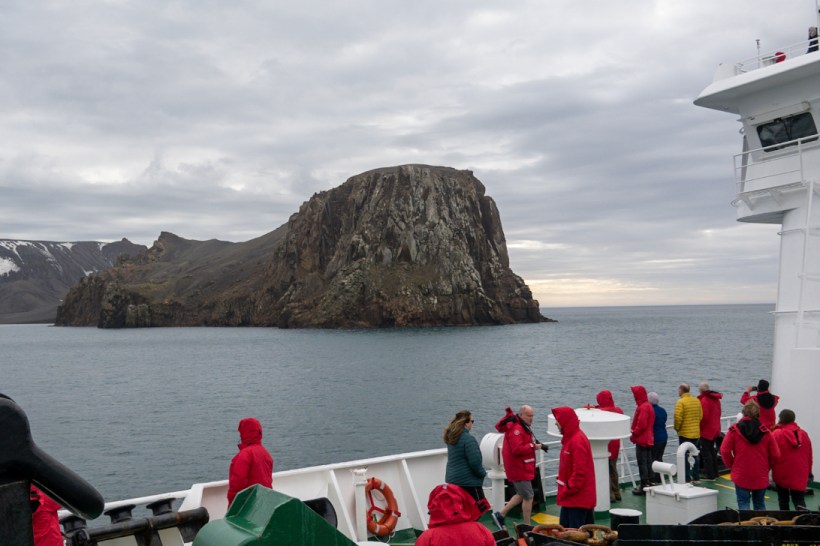 The captain raised the anchor straight away and instead of mooring where we were as per Plan A, we headed north back to the South Shetland Islands. We’d have gone there anyway after the campers were back on board but we’d only have gotten a quick zodiac exploration. We sailed through the night and an hour after Mario gently coaxed us awake through the PA system, Deception Island loomed outside the ship.