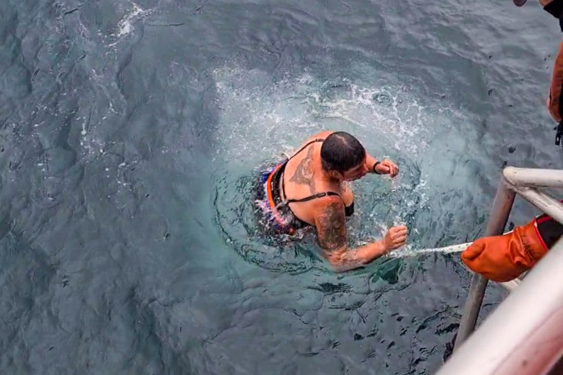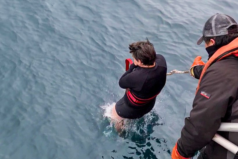 The staff had this shit down. You’re tethered to the boat for safety and they had the next three people harnessed and ready to go. As soon as you reentered the mudroom you’d be given a towel, your harness would be removed and put onto the next person, Mario would give you a hug and Sarah handed you a shot. Best conveyer belt ever. Then it was my turn. I was clipped in, I checked probably more times than necessary that I was safe to jump, plopped into the water like an uncoordinated tellytubby and fuckfuckfuckfuckfuck! Oh dear gosh yes, that was cold.