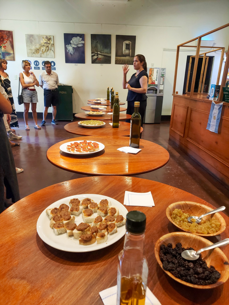 We were shown the machines used to crush the olives and extract the oil, and they told us they don’t go for a second round of oil extraction. They use the olives once then they sell them to other factories that make your bog standard oil. Then we were shuffled into a room where bread and oil was laid out for us to apply to our faceholes. Ooh yes please! They had your plain extra virgin olive oil, but then they had the flavoured stuff. Garlic, oregano, lemon, chilli. Would it be considered rude to just lie on the floor and have Tarrant drizzle it all directly into my facehole?