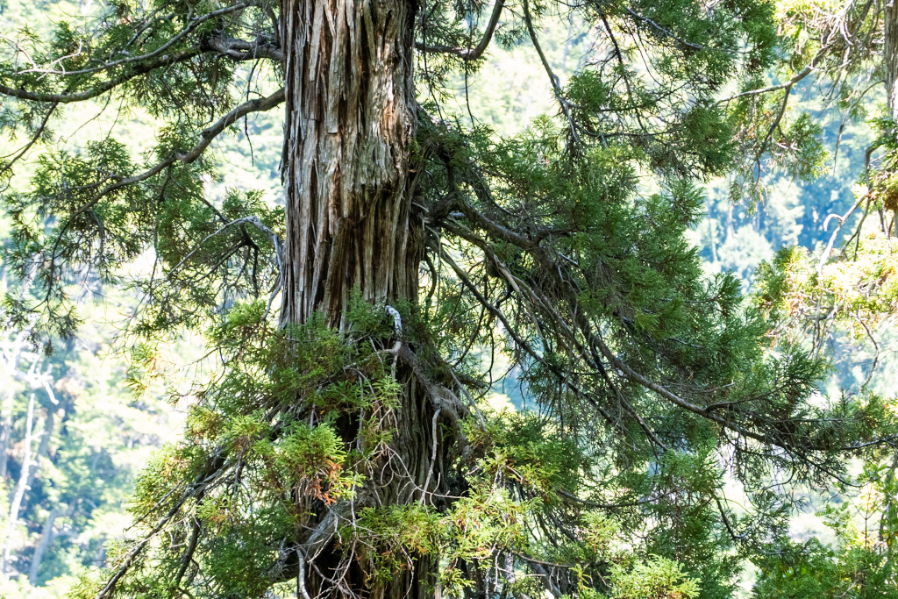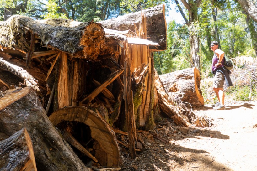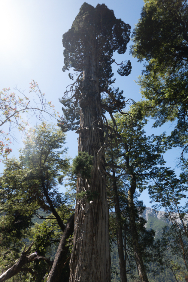 There was quite a lot of dragging ourselves up hills in the heat, past felled coihue trees. Apparently they fall down a lot as the roots are shallow and they take healthy trees and footpaths with them. This walk used to be a loop but part of it is closed off now so it’s a there and back. We could walk as far as a 1300 year old beast of an alerces before we headed back to go and see El Abuelo. The tallest, oldest alerces of them all.