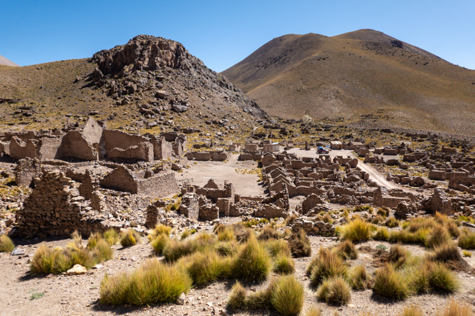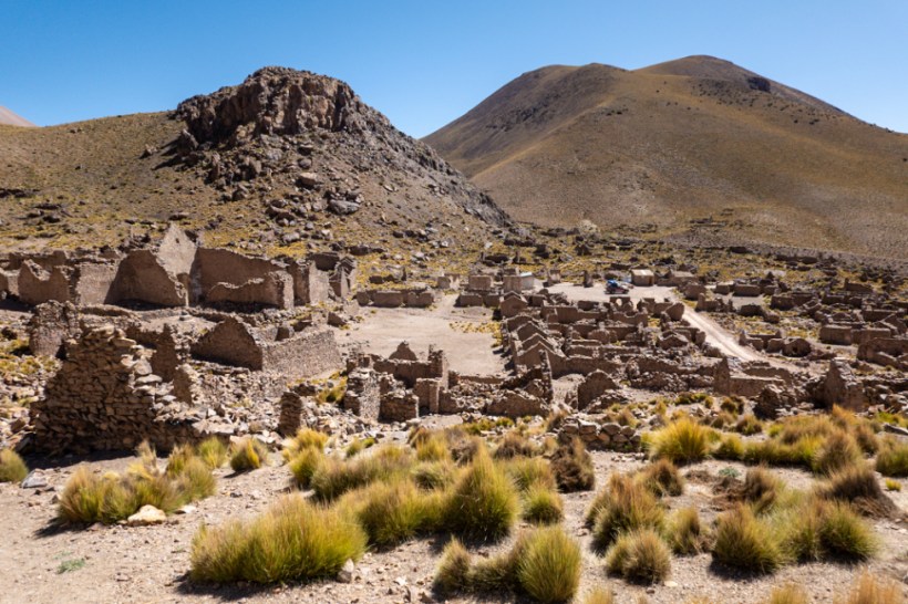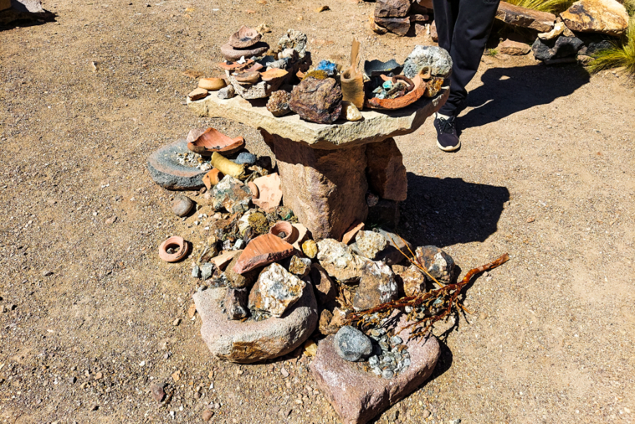 I’m also really enjoying this being dropped off so we can wander around then meeting the car at the other end. We’d been creeping up and up and up and by now we were at 4690 m.a.s.l. and my lungs were making me very aware of this with every step. I was out of breath just getting out of the car. Fortunately it was downhill to the ruins from where we were dropped and we had to walk past a bloke who had a table full of rocks, ceramics and powder. Silver, zinc, copper, fragments pottery from colonial times. It did used to be a mining settlement called San Antonio del Nuevo Mundo until the mining went to shit and the town was abandoned.