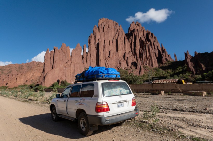 Right then. First stop was another look at those insane rock formations you see around Tupiza. We pulled up just outside of the town for a good gawp. The driver, Bernaba, told us that they were formed by the rain. At least that’s what we decided he told us. He spoke slowly and carefully, it’s not his fault our Spanish is rudimentary at best. They look so fragile and porous, I feel like they’re going to collapse at any moment. If you look closely you can see the red expanse of rock holding thousands of smaller stones in place. Yeah, I wouldn’t go setting up a tent for a nice sleep too close.