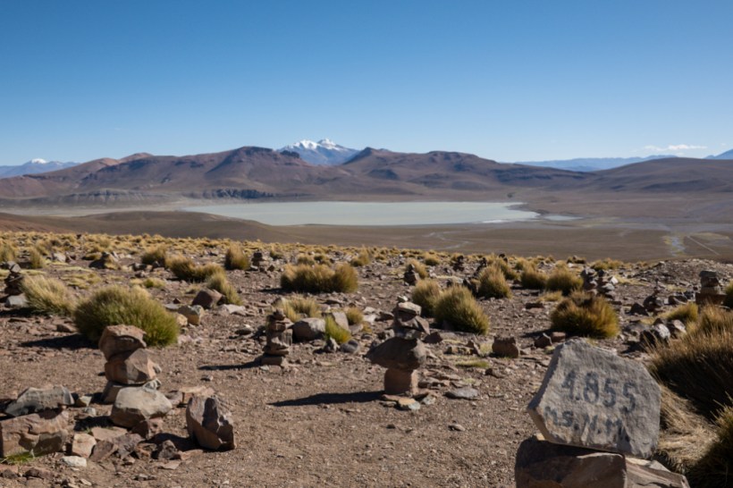 Not long after the Pueblo Fantasma we pulled over for the Mirador de Laguna Morijón with the absolutely stunning volcano, Cerro Uturuncu, photo bombing every shot. We were at 4855 m.a.s.l. by this point, as indicated by a handy sign telling us so should the lack of oxygen at this altitude claimed enough brain cells that this information trickled straight out of an ear. There are also loads of those little piles of rocks that humans are obsessed with building anywhere that rocks have the audacity to not be in piles.