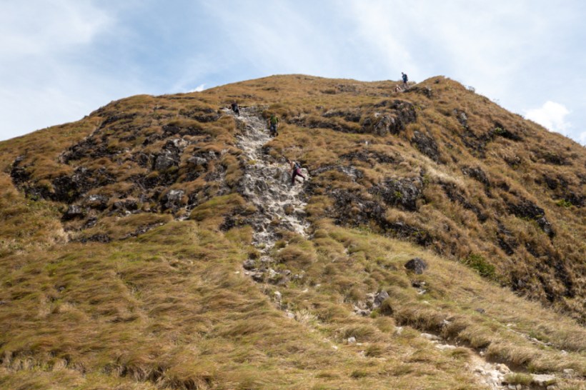 After we’d gingerly lowered ourselves to the bottom we were faced with a decision. The done thing was to climb immediately up the fuck off great big hill in front of you and walk along the ridge, the body of the Sleeping Indian, but it was completely exposed and there’d be no way I could do that with this wind. There was also a very narrow path clinging to the hillside which led directly to the cross. I didn’t want to do either of them. I actually just wanted to sit down and cry but that wouldn’t have helped anyone. We opted to head to the cross, at least the hill would shield us from the wind and I could pointedly ignore the drop to the left of me.