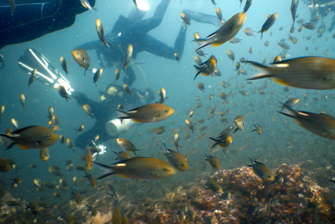 This site was called Faro, or Lighthouse in English, and we were looking for bull sharks! Fuck I love sharks. The current was pretty brutal but Luis, our divemaster, did say it would be and we were just going to go with it. I’m not a huge fan of drift dives, they feel chaotic to me. I pointed my face at as many fish as I could as we were swept along and then Luis got us all to kneel on the seabed. Well, not kneel, you can’t kneel for shit when the current is hell bent on relocating you to the Mariana Trench. We all hung onto whatever we could and waited.