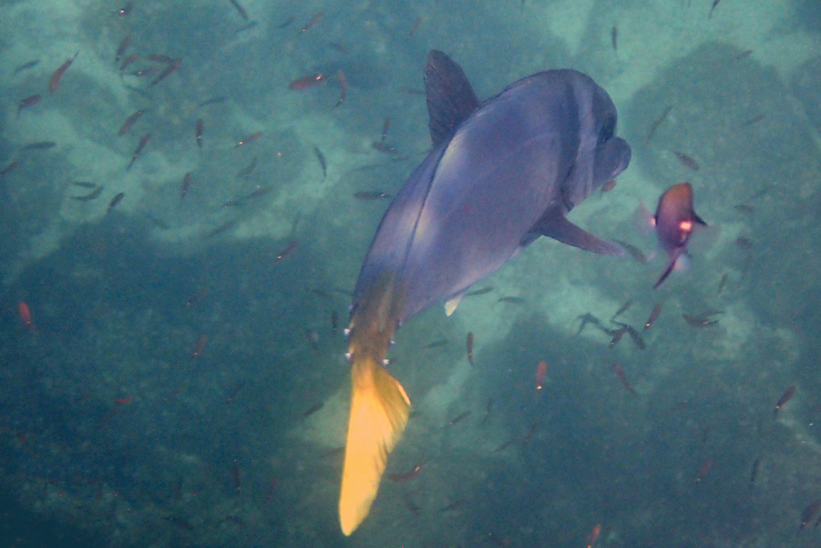 I had to squeeze my blubber into a long wetsuit for this on account of the tiny jellyfish they have so that was fun. There’s no dignified way to get into a wetsuit. There were only six divers and three staff on the boat which is the maximum they can cram on and it was one of those trips where they assemble your equipment for you and help you into your BCD whilst you will your inner ear to ignore the bobbing of the boat. To be fair it wasn’t that bad. The drive out wasn’t too choppy at all, just a few of those spine shockers as the boat bounced over waves, and we were joined by a pod of dolphins for a short while.