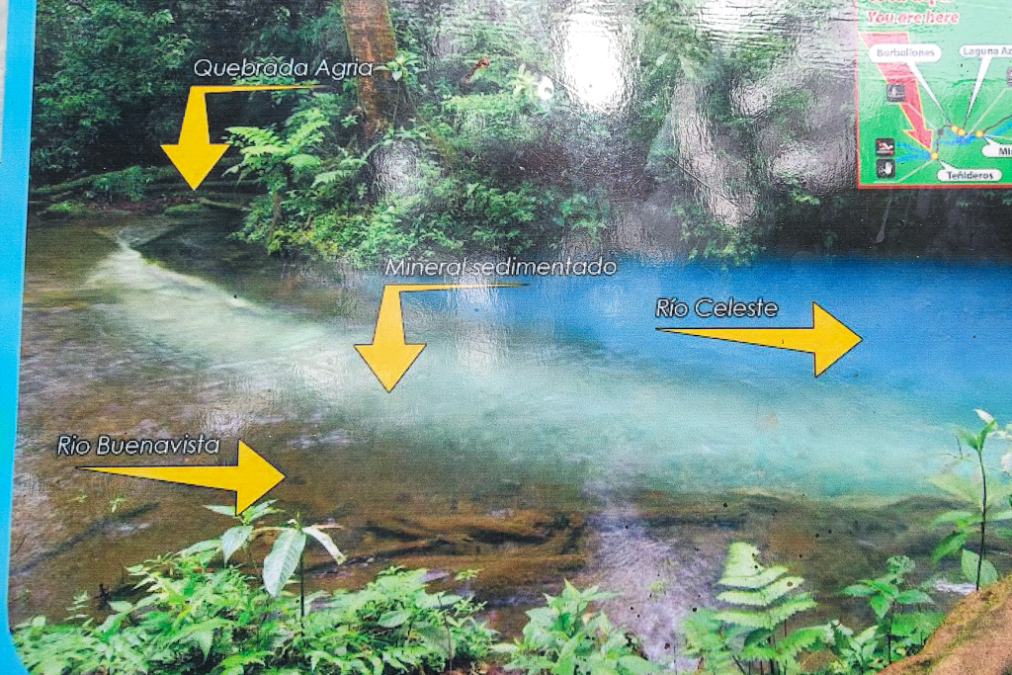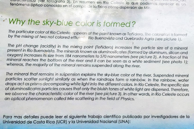 It’s quite the sight. There’s a board explaining the science behind it, apparently when the two rivers meet it changes the pH thus increasing the particle size of a mineral present in Rio Buenavista. Some of the mineral sinks to the bottom and appears as a white residue, the rest remains suspended in the water and light refracting through it causes the sky blue colour. Fuck it, here’s the photos I took of the board, it explains it way better than I can paraphrase it.