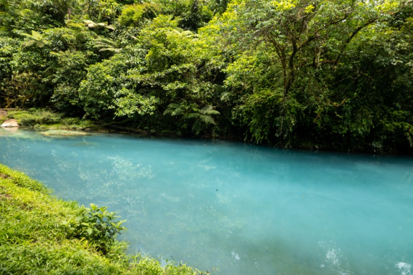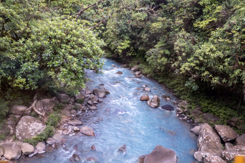 We rounded a corner and Mario pointed out the source of the smell; little bubbles of gas blasting to the surface of the river. He said if the volcano didn’t have pressure outlets like this then it’d erupt more often. There was a sign labelling the phenomenon as “borbollones” which, according to the mighty Google, means “gushing”. That’s a good word isn’t it? Gushing. Right up there with “moist”. Anyway, we left the moist gushing behind and headed to something they call the Teñideros which is where two perfectly normal coloured rivers, Rio Buenavista and Quebrada Agria, meet to form the insanely blue Rio Celeste.