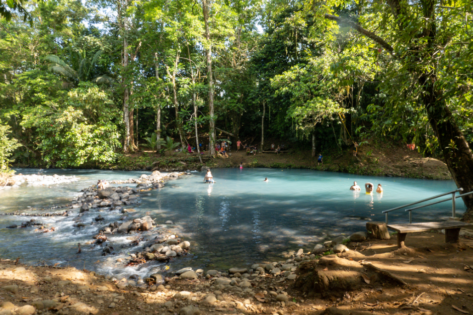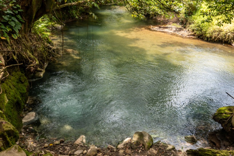Absolutely stuffed, we waddled back to the minibus and bounced along another rough track led by Negro, an adorable dog from the restaurant who wanders up to visitors and presents the belly for immediate rubs. I don’t think you’re permitted to refuse, nor would you want to. He’s such a lovely doggo. We were heading to our final stop, a swimming hole on the Rio Celeste which meant we got to submerge ourselves in the weird, blue water. Obviously it’s just water but that’s not the point, it’s somehow better when it’s more beautiful.