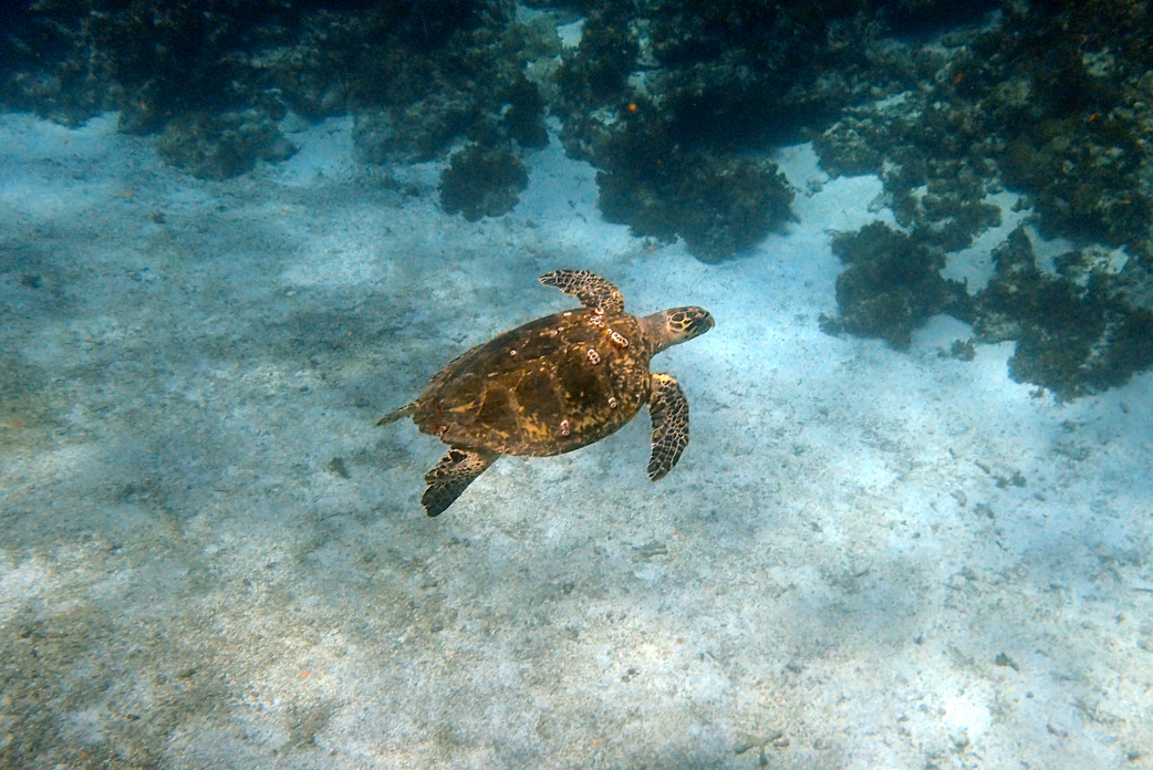 We also saw a stingray which was pretty awesome, and a turtle wandered up to get some air so we stared at that for a little bit. Actually I frantically pointed whilst yelling, “Turtle! Turtle!” at Tarrant except I forgot to take my snorkel out to do so fuck knows how that sounded. You can show me a hundred turtles every day and I’m still going to get excited. The boat driver met us and pointed out where we should snorkel to next so we duly did that, then he sent us over a coral garden which definitely made my bumhole twitch a bit. Like, we had to maneuver between the corals as the surge pushed us one way then another. Don’t get me wrong, it’s a beautiful coral reef, it’s just that I generally like to be slightly further away from it. I was wearing fins so I had a bit more power but Tarrant was trying to get through with her regular human sized feet and all I heard from her was “Fuck fuck fuck fuck!”