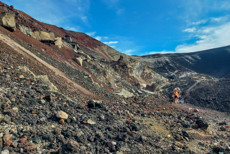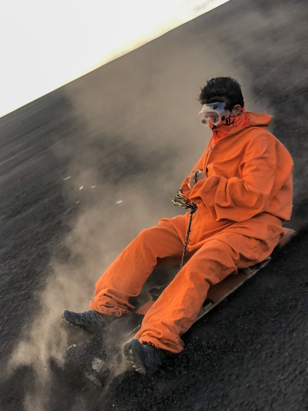 Tarrant went before me, probably a bit faster than I was comfortable with and I hoped she’d retain at least 70% of her skin. When it came to my turn I bum shuffled on my board and off I fucked. It’s actually really easy to go slow to start with, I even had to use my feet to drag the board. It’s a bit soft lumpy at first and the board quickly got buried in the ash and gravel. Once I got going properly I kept it steady as possible but it kept trying to veer. As I passed the guy taking videos I just clung onto the board, concentrating on not going too fast. It’s steeper here and a lot smoother. I thought I was going pretty fast but Tarrant took a video. Dear reader, I was not. I think if you zoomed in on my goggles all you’d see is wide-eyed terror. I did, however, have fun and I’m really pleased we did this.