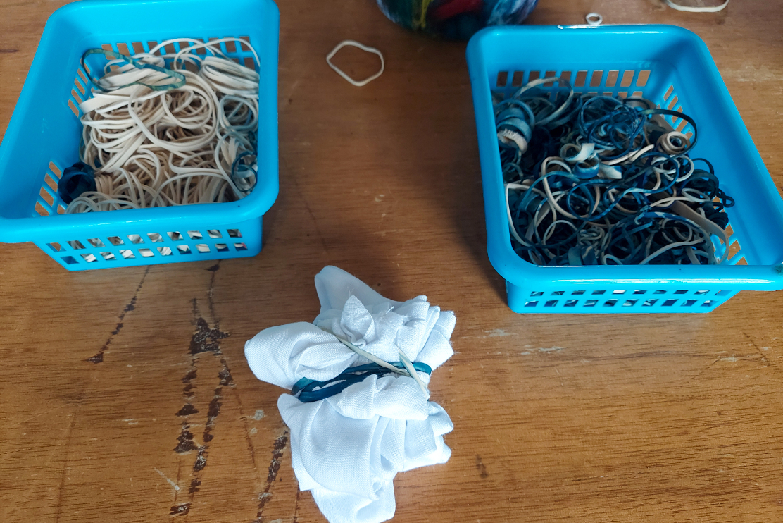 Then we got down to business! Irma showed me how to fold a cotton scarf (you can only use natural fabrics with natural indigo) and I tied two elastic bands around it, then I wet it in plain water, then we she led me to a big, plastic rubbish bin. She was about to take the lid off when she turned to me and said, “The smell, it’s… not good…” Oh my fucking gosh, she wasn’t joking either. Indigo is very pretty but the stench of it! It stinks like sulphur. But I wanted my lovely, indigo souvenir so I sat down and stuck my little bundle of cotton into the bog of eternal stench.