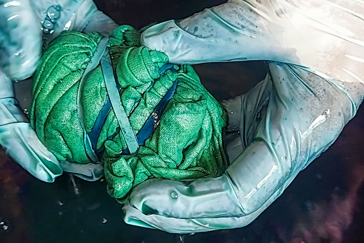 So it’s not as easy as sticking it in and moving it around (that’s what she said), you’ve got to manipulate the fabric to get the colour right in there then when you take it out it’s not blue at all. It’s green. You remember during the extraction you have to get oxygen into the green liquid to turn it blue? You have to do the same and guys, it turns blue right before your eyes like smelly magic. You manipulate the ball of fabric, getting into all the corners, then repeat as many times as you want to get the desired colour. I like dark blue so we dipped it three times, took one elastic band off then dipped it twice more. It’s quite meditative. She did say if she’d had a stressful day then sitting down and doing some dying can sooth her.