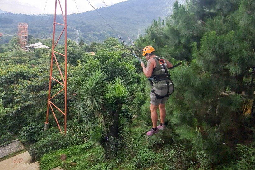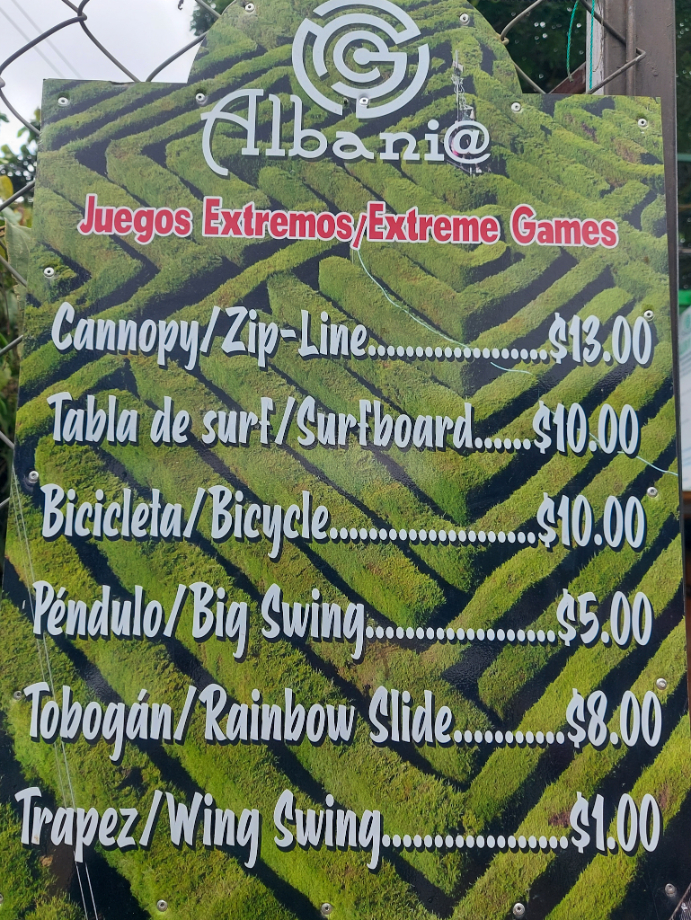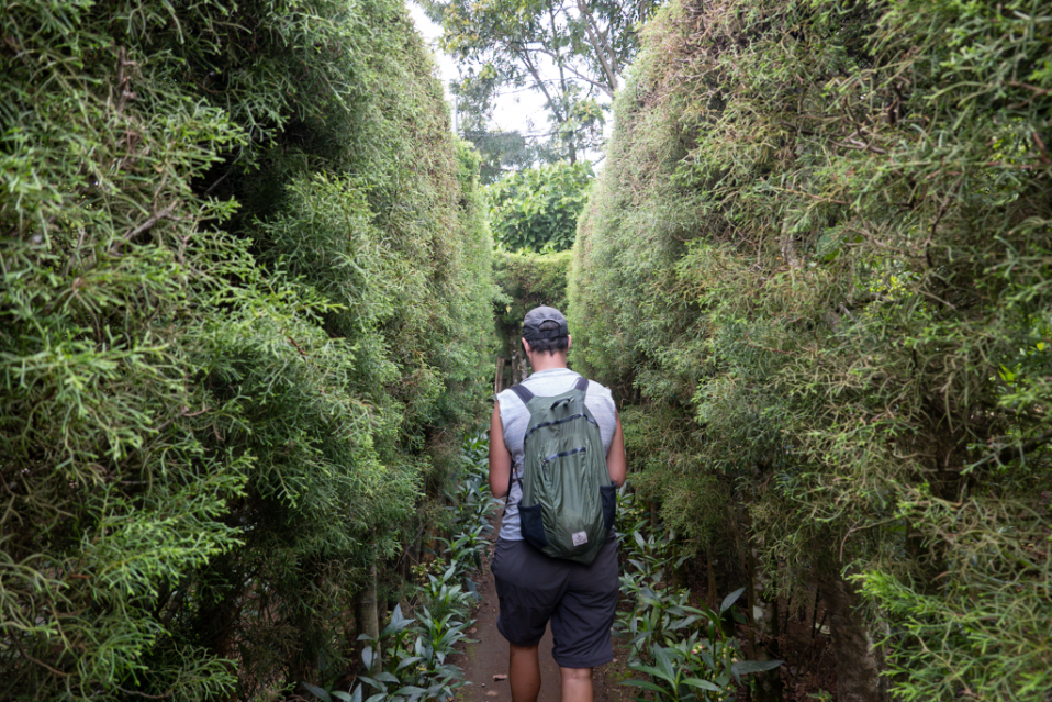 We hopped back on the bus and jumped off outside Cafe Albania in Apaneca. We’d heard they had a big maze here but it also turned out they had a few adrenaline games which explained the blood curdling screams. They have this, like, highwire bicycle thing which combines two of my least favourite things, bicycles and heights, so that could fuck off. But there was also a giant swing. Well now, that’s a bit temping but you don’t jump, they literally remove the ground you’re standing on so you fall and just the thought of that made my bumhole twitch a bit. Let’s go and solve this maze then whilst I have a little think about it.