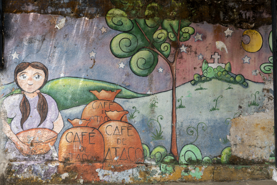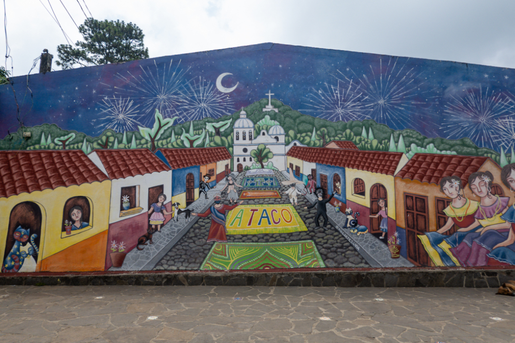 The following morning we started our day with the obligatory search for pupusas and coffee and I’m so going to miss shovelling these little discs of joy into my facehole twice a day. Then we hopped onto the 249 to Ataco, a little town with a viewpoint, but it’s mostly known for the many murals that adorn the walls. We hopped off the bus and made our way up to Mirador del Cruz for some cracking views over the small town. Someone had set up a stall and was selling drinks so obviously we bought a couple because we want to encourage this kind of behaviour. Every viewpoint should have someone selling drinks. It should be international law.
