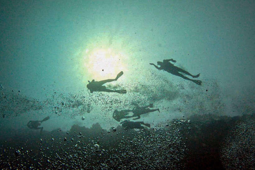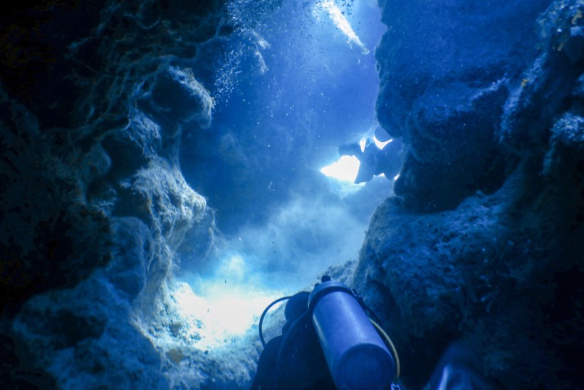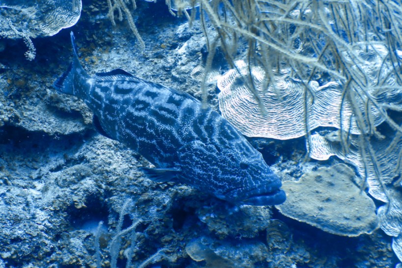 It’s two hours from Caye Caulker to the Blue Hole, less if conditions are good and I think they were. I nod-slept at the back of the boat for most of it but the Dramamine did its job and everything in my body stayed where I left it. We dropped the snorkellers off then headed to where we’d be giant striding into the water. Down you drop to forty metres, and this is what was making me a bit nervous. The depth. There’s rarely any reason to go to forty metres, all the cool shit is usually a bit shallower, but what you’re looking for here are the rocks and those fuckers are inconveniently located at forty bloody metres.