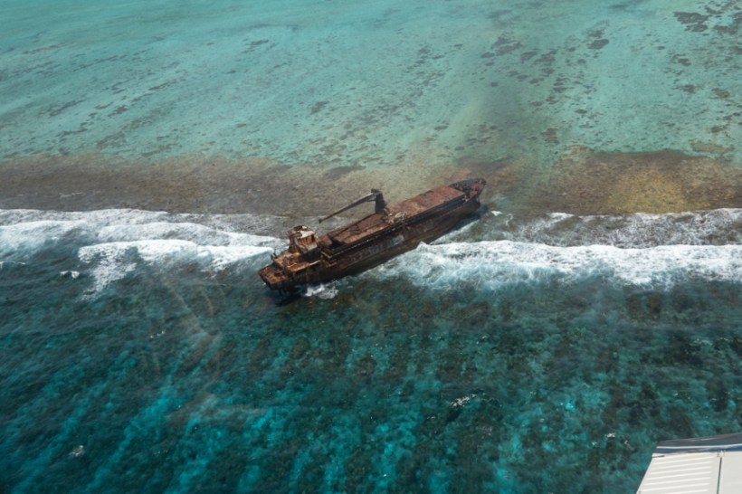 It definitely earned the gasps of appreciation from the five passengers in the plane. We were really lucky with the weather too, the sun was out and really brought out the colours around the reef. There was a boat floating over the rim which had the good grace to be really photogenic too and it added scale. Duane circled it twice on one side then turned around and circled it twice on the other side and I didn’t even feel a bit sick so that’s a win all round. I was so blown away by the Blue Hole that I forgot we were also going to look at a wreck.