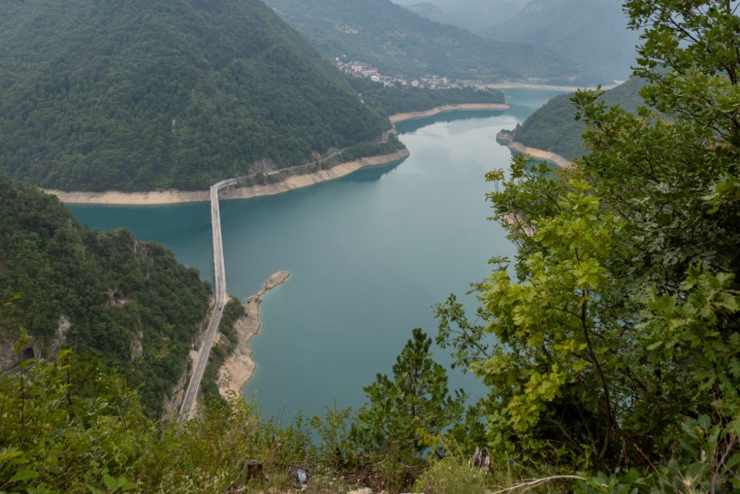 - The first viewpoint driving out of Plužine is at 43.172988, 18.859681.